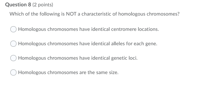 Question 8 2 points Which of the following is NOT a characteristic of homologous chromosomes. Female sex chromosomes X and X are homologous while male sex chromosomes X and Y are not truly homologous. B They carry information for the same traits.